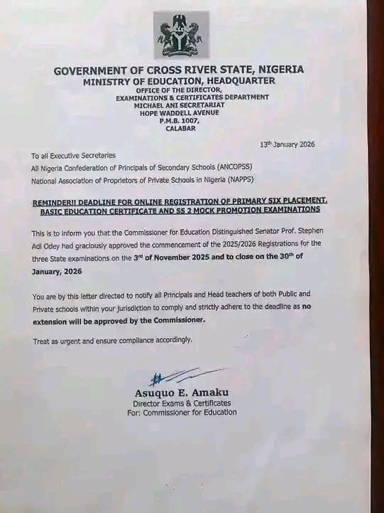 This is to inform the general public, particularly school administrators, that the Commissioner for Education, Distinguished Senator Professor Stephen Adi Odey, Esq., graciously approved the commencement of the 2025/2026 registration for the following State examinations on 3rd November, 2025: