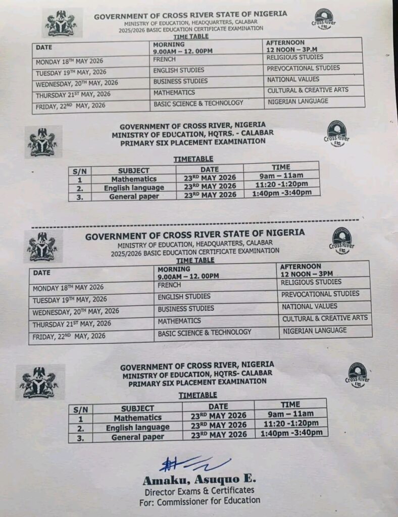 RELEASE OF 2025/2026 EXAMINATION TIMETABLE
