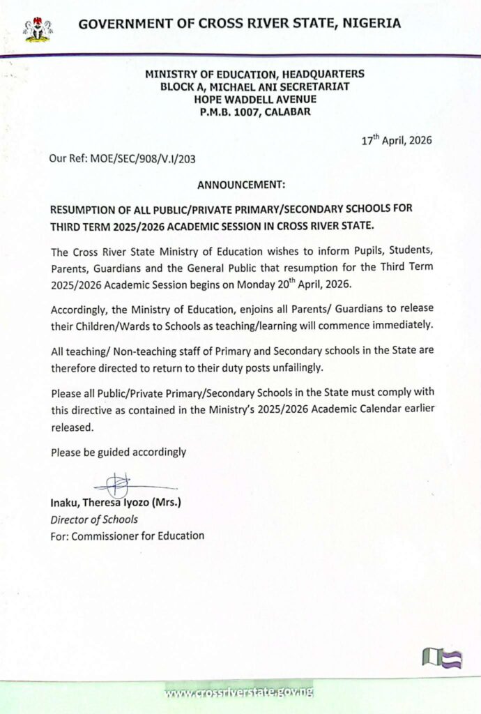 The Cross River State Ministry of Education wishes to inform Pupils, Students, Parents, Guardians and the General Public that resumption for the Third Term 2025/2026 Academic Session begins on Monday 20th April, 2026.