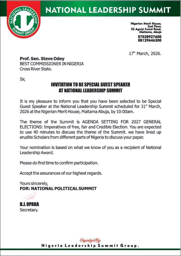 Senator Professor Stephen Odey, Esq., Cross River State Commissioner for Education, on Tuesday, March 31, 2026, delivered a powerful Keynote Address as Special Guest Speaker at the National Leadership Summit held at the Nigerian Merit House, Maitama, Abuja. With the theme “Agenda Setting for 2027 General Elections: Imperatives of Free, Fair and Credible Elections,” the summit brought together distinguished scholars, captains of industry, and political leaders from across Nigeria to chart a way forward for the nation’s democracy.