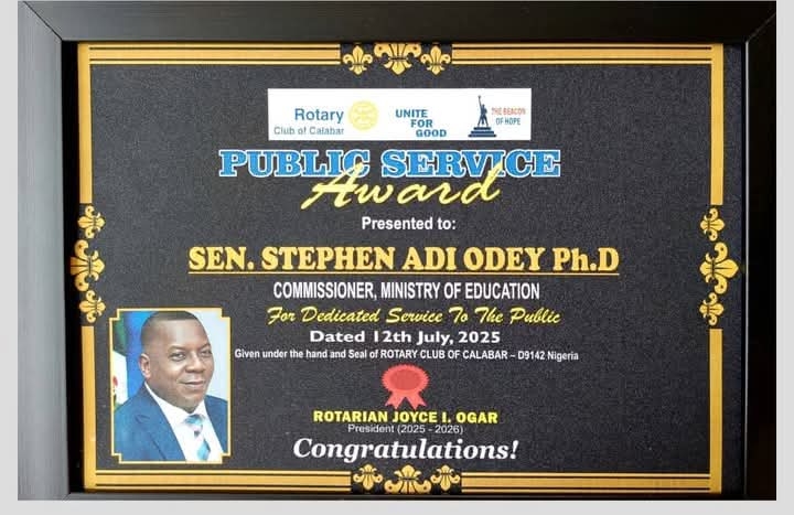 Associate Professor Odey was among several distinguished Nigerians recognized for their invaluable contributions to societal advancement and global betterment. Dr. Moses Agboreyo, Director of Higher Education at the Cross River State Ministry of Education, represented the Commissioner and received the award on his behalf. The award was presented by Rotarian Joyce Ogar in her capacity as President of the Rotary Club of Calabar. Senator Odey commended the Rotary Club Calabar for its selfless service as he expressed appreciation for the award and pledged to continue rendering more service to humanity.