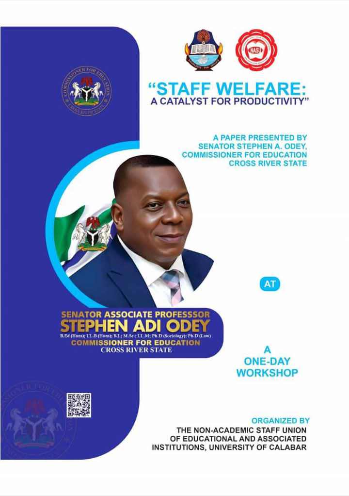 Senator Associate Professor Stephen Odey, Commissioner for Education Cross River State, presented a paper titled ‘Staff Welfare: A Catalyst for Productivity’ at a one-day workshop organized by the Non-Academic Staff Union of Educational and Associated Institutions, University of Calabar chapter, earlier today. The Commissioner emphasized the significance of staff welfare in enhancing productivity.